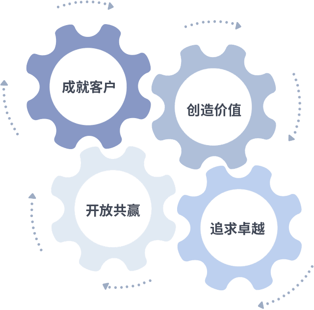成就客户是一切决策的出发点,,创造价值是衡量所有工作的标准,,,,追求卓越是我们做事做人的态度,,,,开放共赢是我们的格局也是最终的结果。。。。价值观的齿轮环环相扣,,推动着组织里的每个人不断向前。。