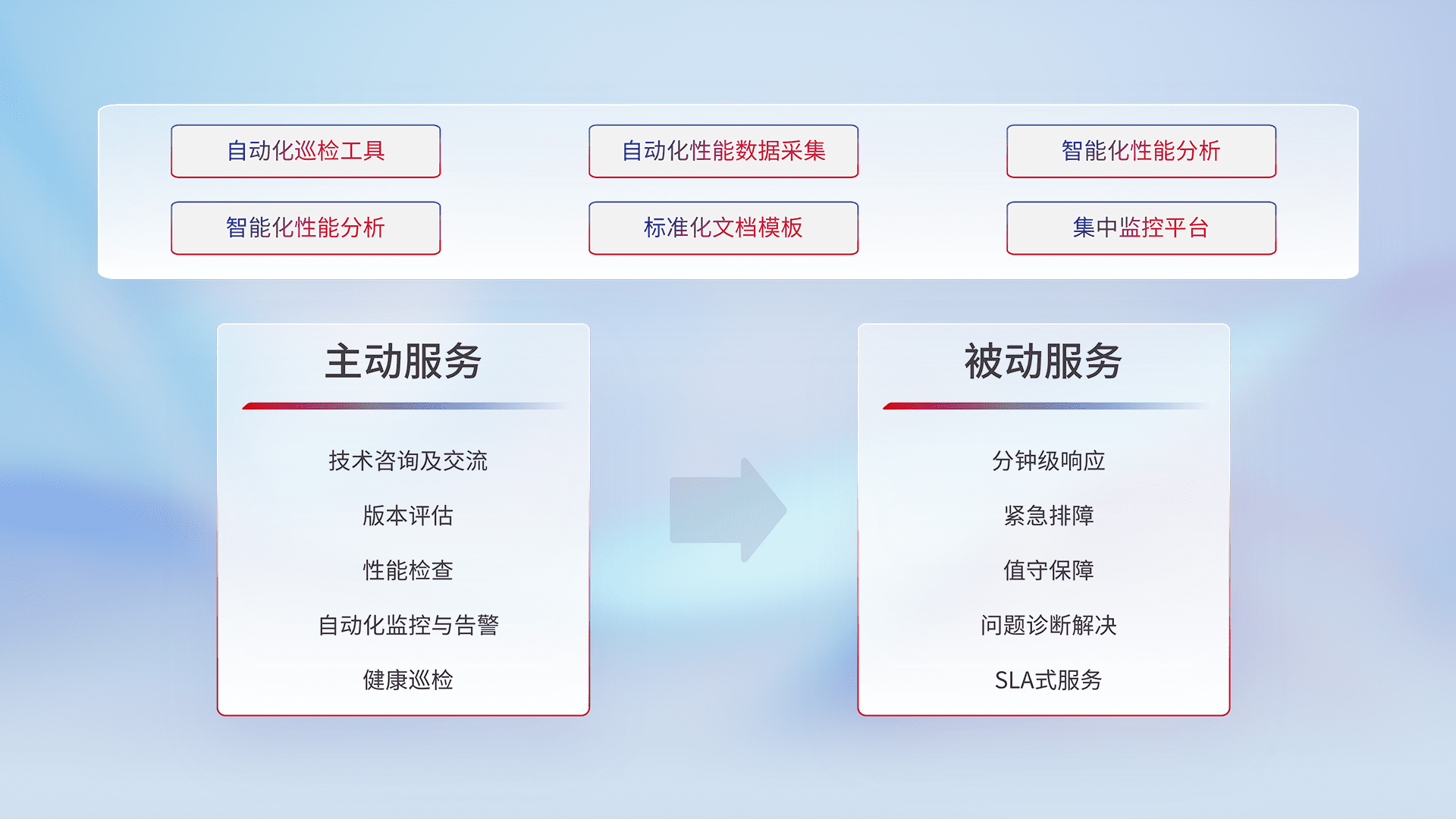 智能化工具和标准化文档,,保障服务质量,,提供主动服务(包含技术咨询、、、、版本评估、、性能检查、、自动化监控与告警、、、健康巡检)和被动服务包含(分钟级响应、、、、紧急排障、、、、值守保障、、问题诊断解决、、SLA服务)。。。。