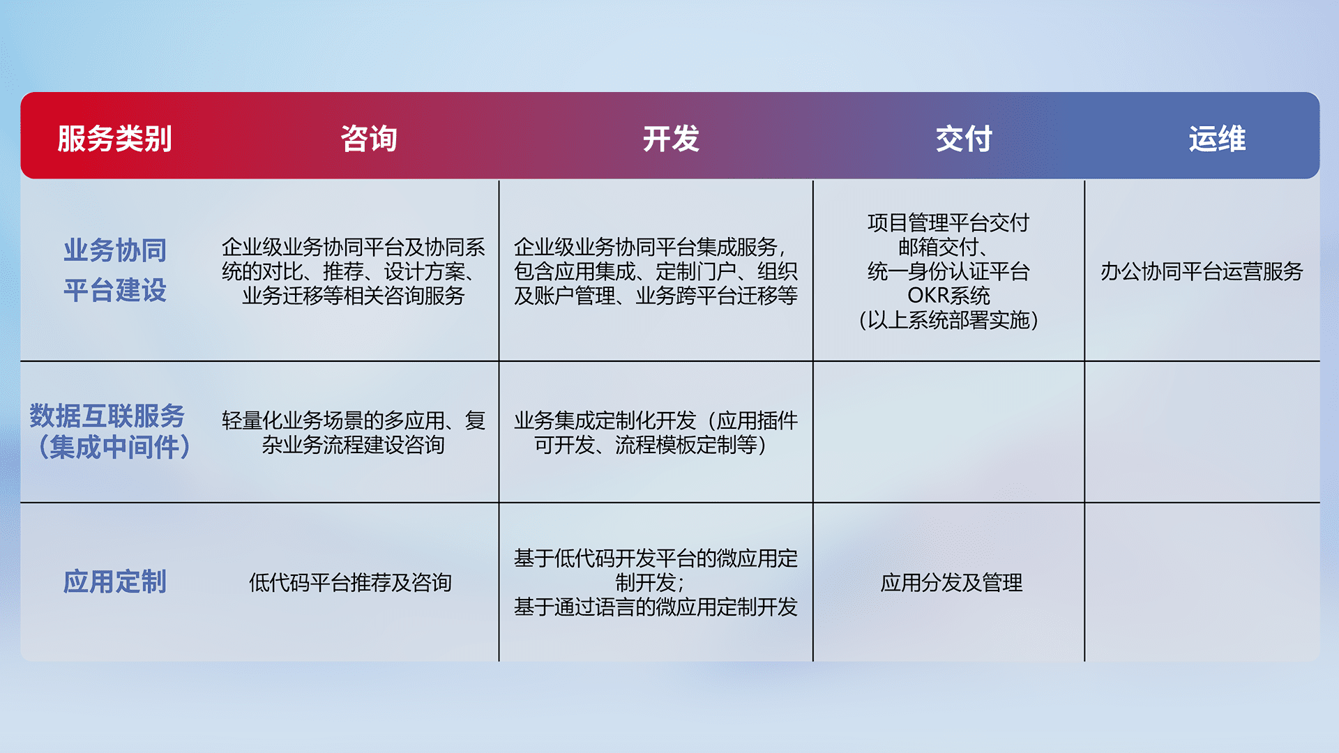 针对钉钉、、、企微、、IDaas等平台级产品提供产品的规划、、方案、、、交付、、、、定制化开发等服务,,,实现如统一协同办公、、、、智能客户服务、、、混合会议管理、、、、智能数据查询、、等业务场景,,实现数字化转型。。。